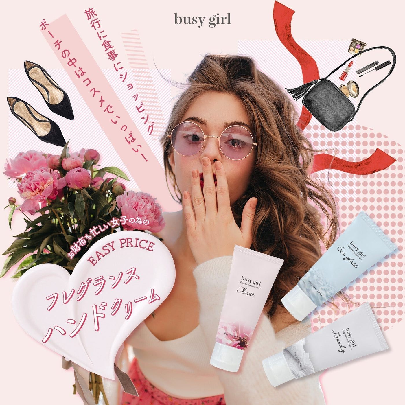 「ビジーガール」から人気の香り3種のハンドクリームが新発売!easyプライスはそのままに、18種のボタニカルエキス*を配合したハンドクリームは、気分の上がる香りに包まれながら、手肌をやさしくしっかりと保湿します。