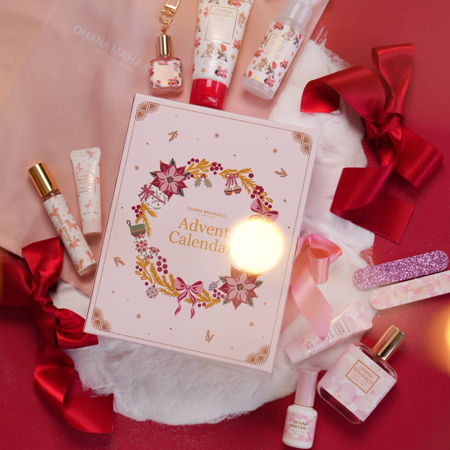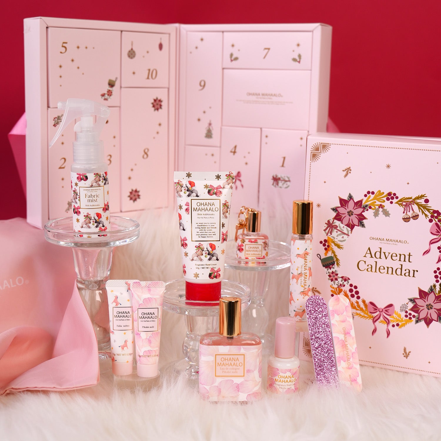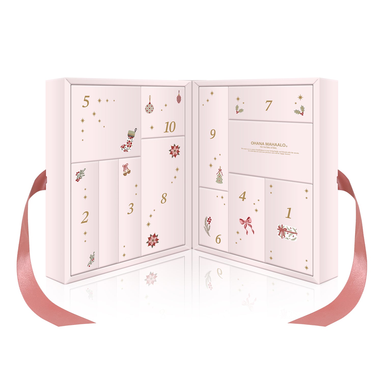 可愛らしいピンク色の本を開くと、中には心ときめくボックスが。その中には、オハナ・マハロの人気定番アイテムはもちろん、このアドベントカレンダーでしか手に入らない限定アイテムを含む、合計10点の特別なギフトが詰まっています。