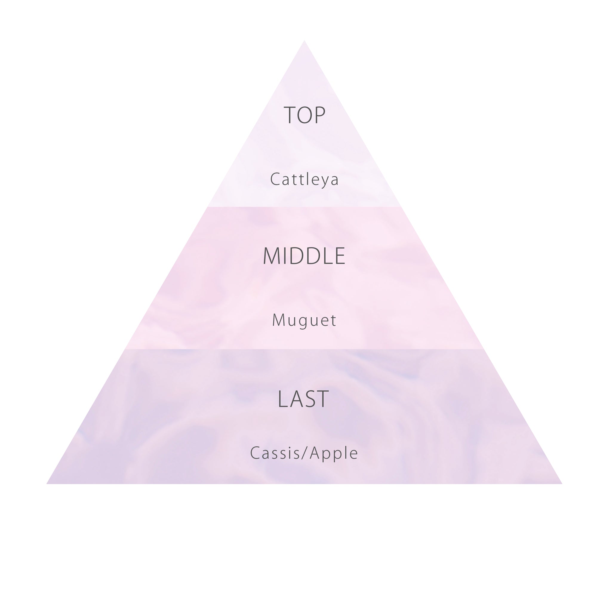 Cattleyaの花ひらく美しい香りをベースに、鈴蘭、カシス、アップルが寄り添い溶け合います。ほんのり青みのある瑞々しい甘さが花開き、ため息が出るほど美しい香りが、あなたを輝かせます。